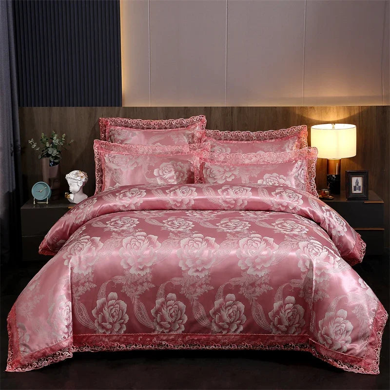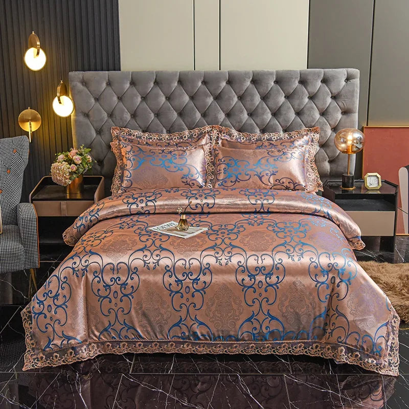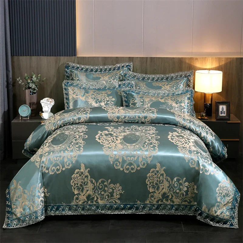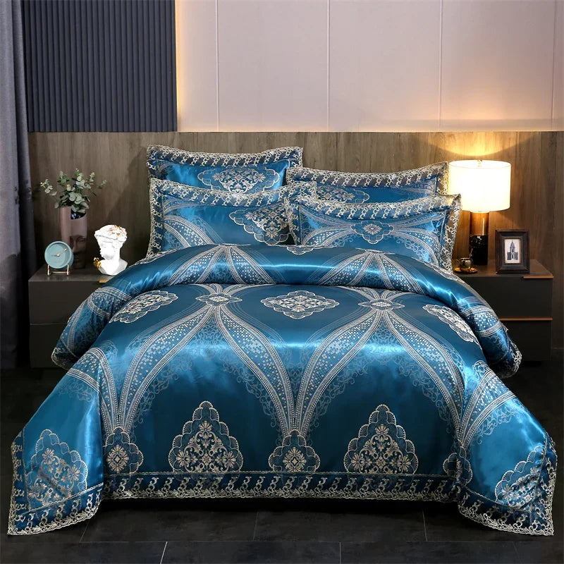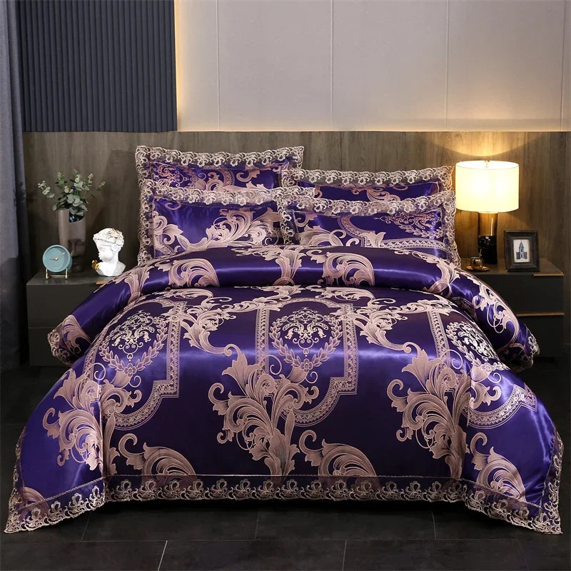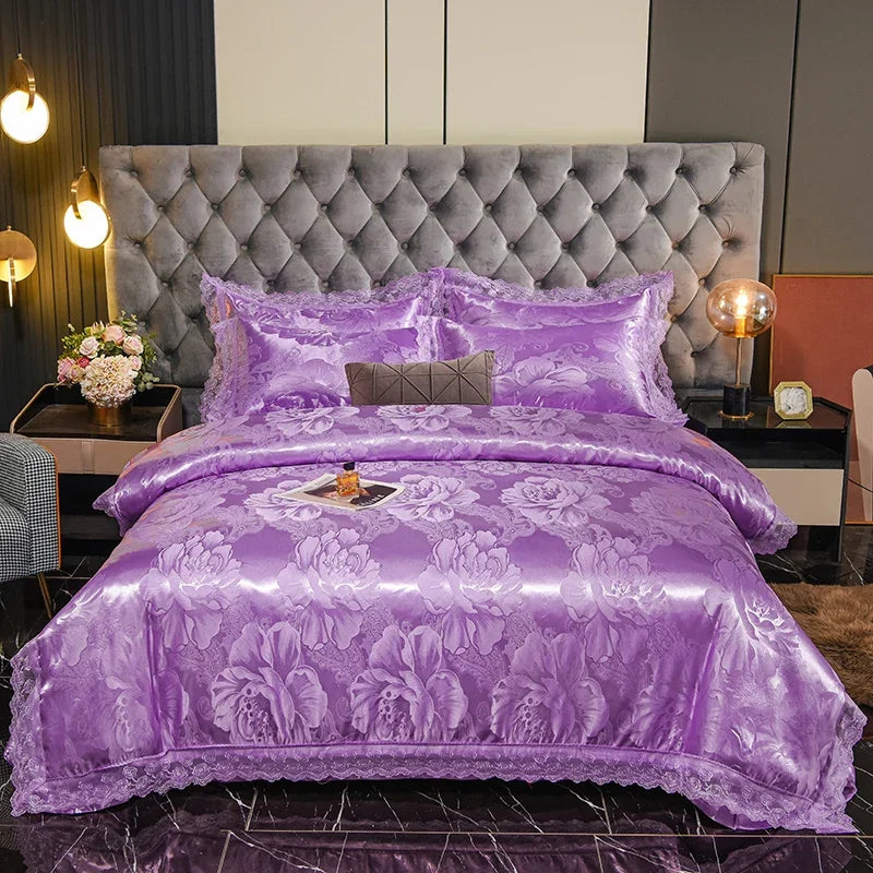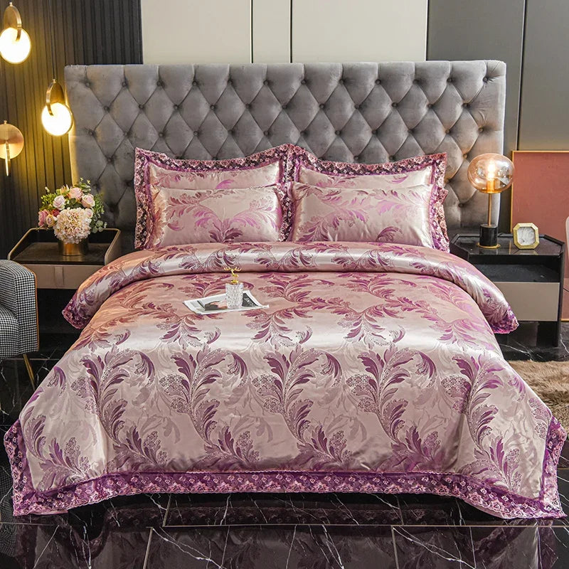 صُمم هذا الطقم خصيصًا لمن يُقدّرون الأناقة، فهو يضم كل ما تحتاجه لتجديد كامل لغرفة نومك. من قماش الساتان الجاكار الناعم إلى حواف الدانتيل الرقيقة، يوفر هذا الطقم فخامة ودفئًا ورقيًا لا مثيل له.
