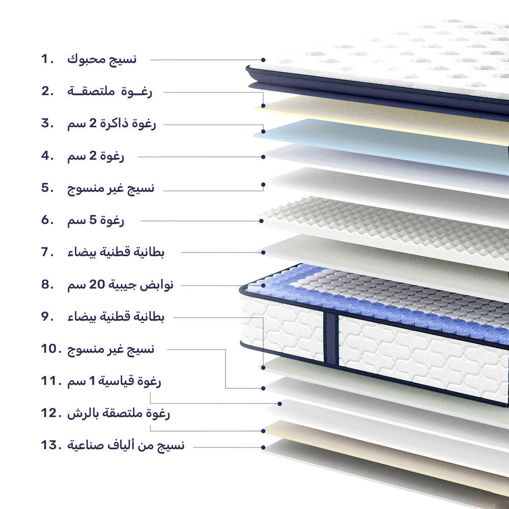 تتميز مرتبة Bezzze بتصميم متعدد الطبقات يتكون من مواد إسفنجية ممتازة مدمجة مع رغوة الذاكرة المريحة لتوفر لك تخفيف الضغط بشكل أفضل، مما يضمن لك تجربة نوم متوازنة ومريحة لجميع الأشخاص الذين ينامون بطرق مختلفة.